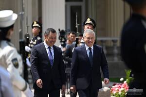 Qarorgoh oldidagi maydonda davlat bayroqlari koʻtarildi va faxriy qorovul saf tortdi.